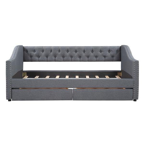 Twin over Full Bunk Bed with Built-in Desk and Three Drawers, Grey This twin over full bunk bed anchors your room in timeless style. Crafted from solid pine wood and MDF, this twin over full bunk bed showcases slatted head and footboards, clean-lined guard rails, and a built-in ladder. Utilizing every space within the bed's structure, a fully assembled three-drawers and built-in desk are built into the side to give you tons of storage opportunity. It can also be divided into two independent beds for even more convenience .Description Bed Material Pine Wood +MDF Size Twin/Full Color Grey Numbers of Package2Assembly Required Yes Dimensions Overall Product Dimension77''L*77.5''W*64''HLoft Bed Dimension75.5''x38''Platform Bed Dimension75.5''x54.3''Total Height64''Number of Each Bed Slats14/14pcsOverall Product Weight180lbUpper/Down Bed Weight Capability250/400lbUpper/Down Bed Mattress Thickness6''/8-10''[Elegant design] Elegant style Upholstered in carefully-selected linen fabric, in elegant gray, feature a diamond-tufted backrest and two armrests with rivets, this daybed not only suits any home décor, but is timeless in its design. The soft textile bedhead creates coziness, while the single color of the design creates versatility.[Solid & Sturdy] The daybed frame is made of solid MDF and particle board, providing a dense and strong support. The construction ensures both a lifetime of use, and a sturdy frame with a backrest which won't wobble.[Maximized space] A pair of drawers under the daybed provide ample storage for your little one's toy's and bedding. Such a versatile piece, bringing functionality, versatility, and style to your home, perfect for those who have lots of visitors.[No Box Spring needed] This daybed frame comes with sturdy wooden slats. Mattress is not included. A comfy linen fabric backrest and two armrests that bring you and your family a cozy feeling.[Dimensions] Overall Product Dimension:82.2" x 4 .7" x 34.4"(L x W x H). Mattress not included. Some assembly is required, although we have provided clear instructions and tools.