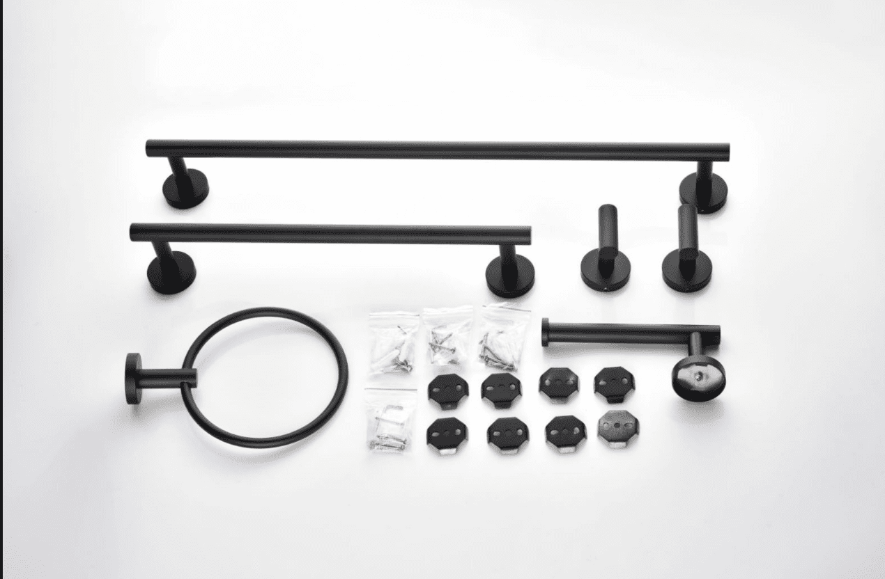 1.Bathroom hardware kit includes: towel holder; toilet paper holder; towel ring; 2 multi-function hooks. Suitable for different styles of decoration.