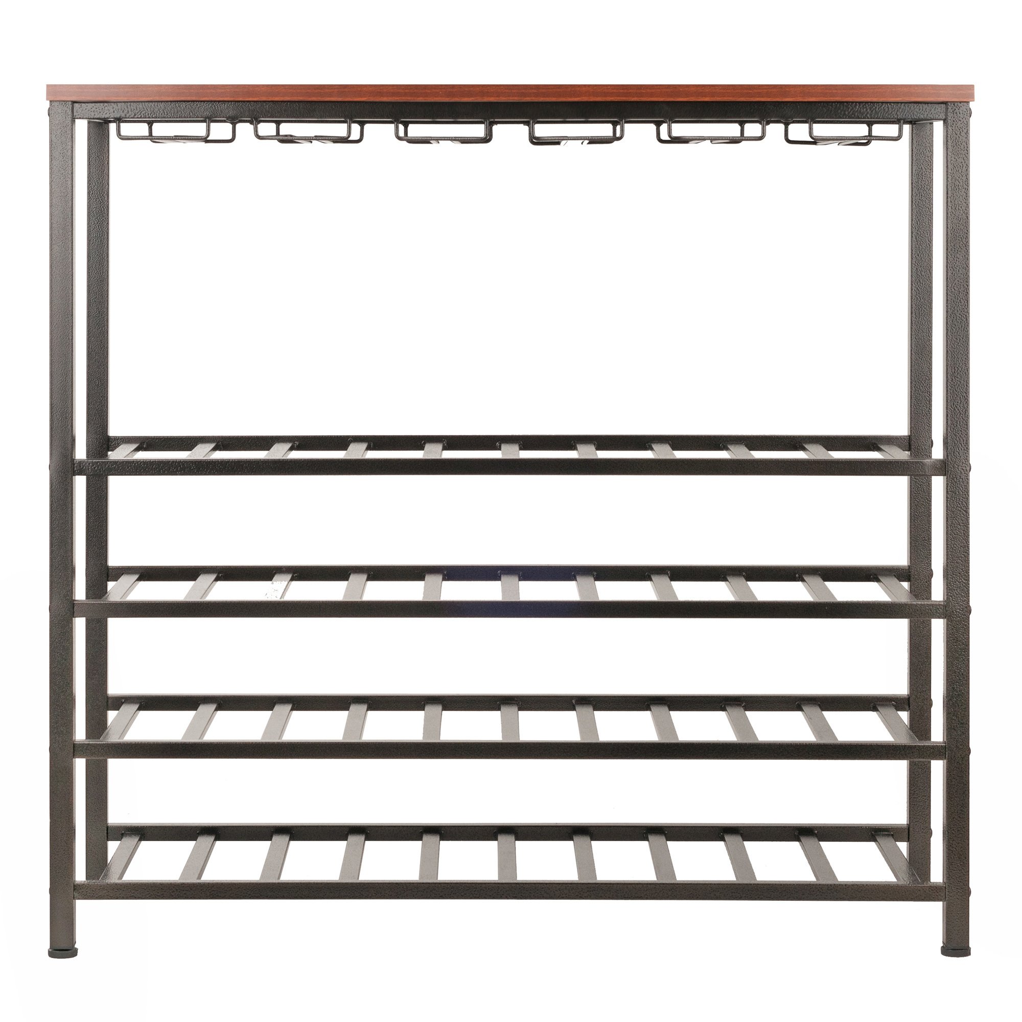 The Michelle Wine Rack with Glass Hanger is perfectly sized for the true wine connoisseur. It has the capacity to store 40 bottles of wine and up to 24 standard sized wine glasses. Its simple and contemporary design will enhance any decor. Show off your wine collection wherever you entertain; or use the Michelle Rack to start your own wine cellar. Made of Antique Bronze textured metal paired with a Walnut finished wood top. The overall size of the wine rack is 38"W x 14"D x 26.4"H.