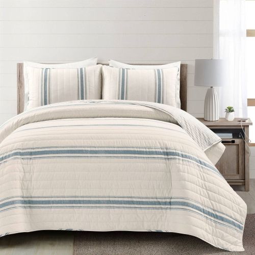This Farmhouse Stripe Reversible Cotton Quilt Set includes a reversible 100% cotton quilt and 2 matching reversible pillow shams. The background color is a creamy off-white color. The quilt and the sham in this Farmhouse Stripe Reversible Cotton Quilt Set are both safe to machine wash and tumble dry. For best results, please refer to the product labels for full care instructions.