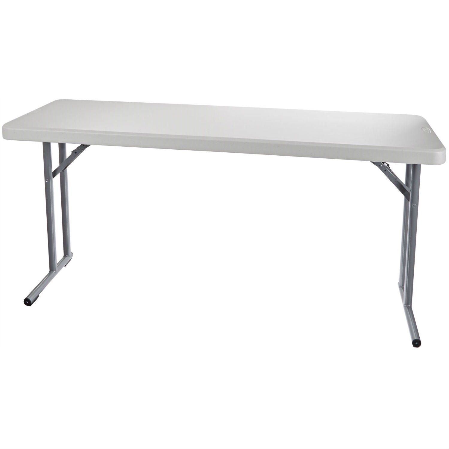 • 60" long rectangular plastic folding table with steel frame for temporary placement and compact storage when not in use
