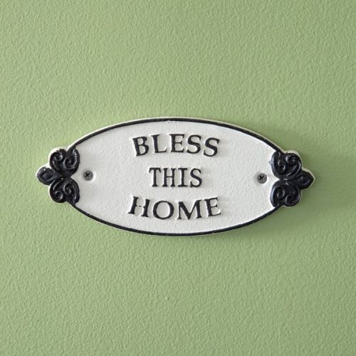 Welcome blessings into a home with this precious sign. Item is crafted from cast iron. To hang, use its two screw-hole hangers.