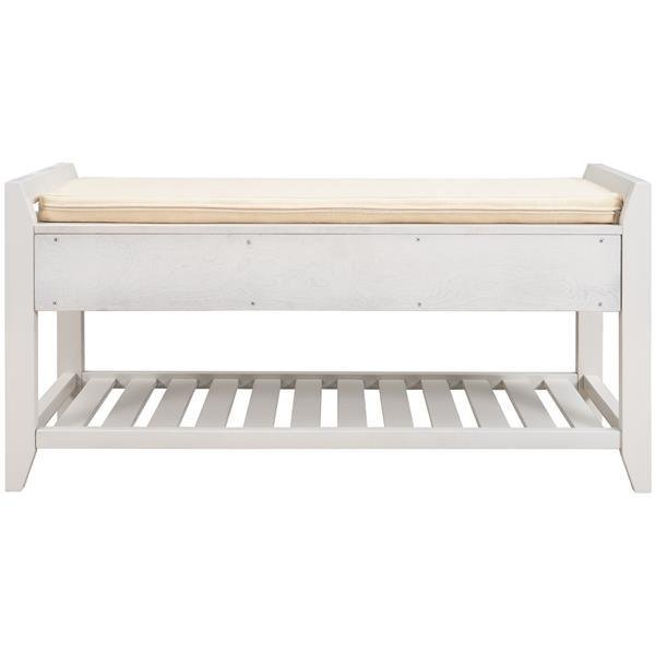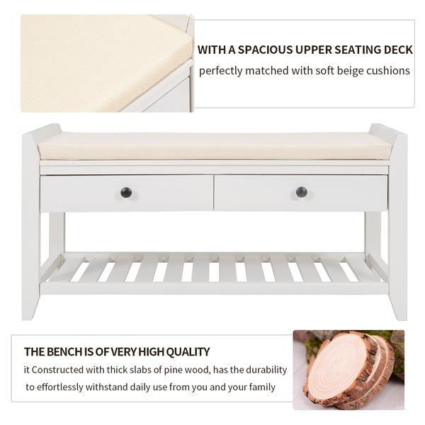 SpecificationFinishPaintingPackage Cartons1 pcProduct Load-bearing70 lbsCountry of OriginalChinaPacking detailsBrown carton with 6 sides foam protect inside. Our product has passed the dropping test according to international standard.Add a touch of organic essence to your abode with this wooden storage bench. The taupe slightly weathered natural wooden finish adds the perfect understated accent to any home, blending in seamlessly with any surrounding décor with 5 shades to choose from. The carefully crafted silhouette emphasizes classic details, including tapered legs and a gridded base shoe rack with dual upper storage drawers fitted with matte black powder coated knobs.Ideal for family use,this classic bench functions as the perfect inconspicuous storage option to tastefully store your personal belongings rather than leaving them out in the open and accumulating clutter. Two spacious sliding drawers sit directly underneath the upper bench seating area giving you easy access to sandals, kids'shoes and more while the underside gridded rack can hold additional shoes or storage baskets to add your own personal touch.This bench proves to be more than an eye-catching accent piece and is manufactured to pull its weight with its heightened functionality. With a spacious upper seating deck, it is fitted perfectly with a soft beige cushion that can be further customized with decorative throw pillows. Comfortable sit down and take your time while you put on you or your child's shoes instead of uncomfortably crouching at the front door. Compact in design this piece also makes a big impact with a small foot print.This bench is manufactured with a premium build compared to competitors. Constructed with thick slabs of pine wood, it has the durability to effortlessly withstand daily use from you and your family and become a household stable. Smoothed and polished to perfection, the wood build is sealed with a protective wood coating this bench is designed to resist humidity while also making it easy to spot clean for dust. Built in handles make it easy to transfer from one place to another.Light assembly required so your bench is ready to go soon after it arrives. If you have any questions or concerns, please feel free to contact us.