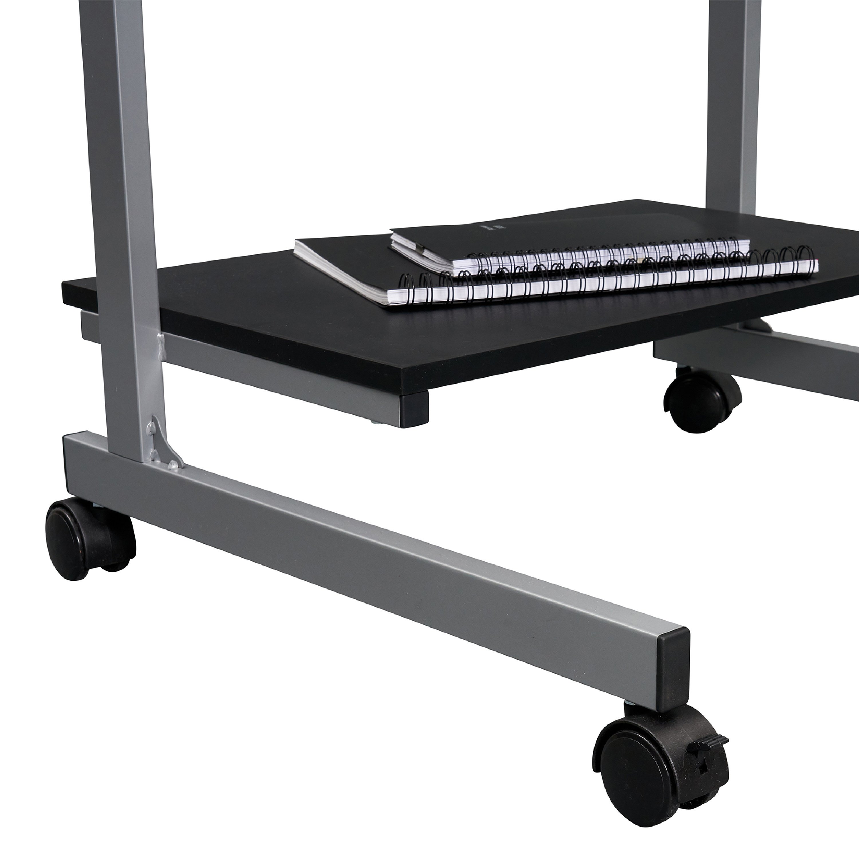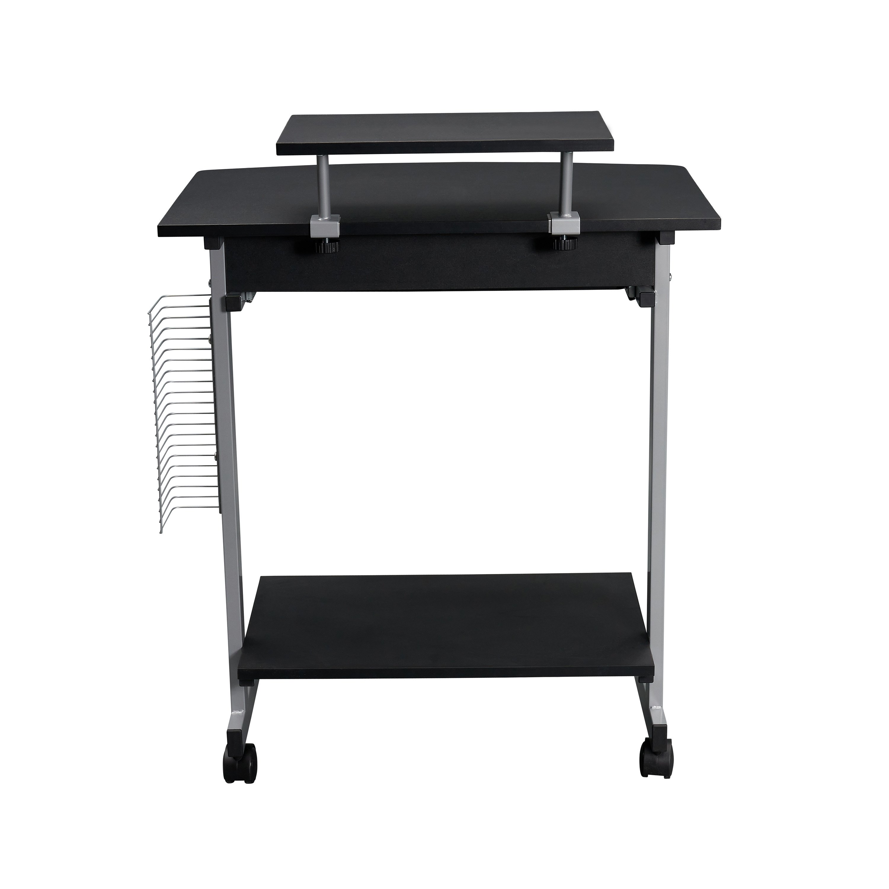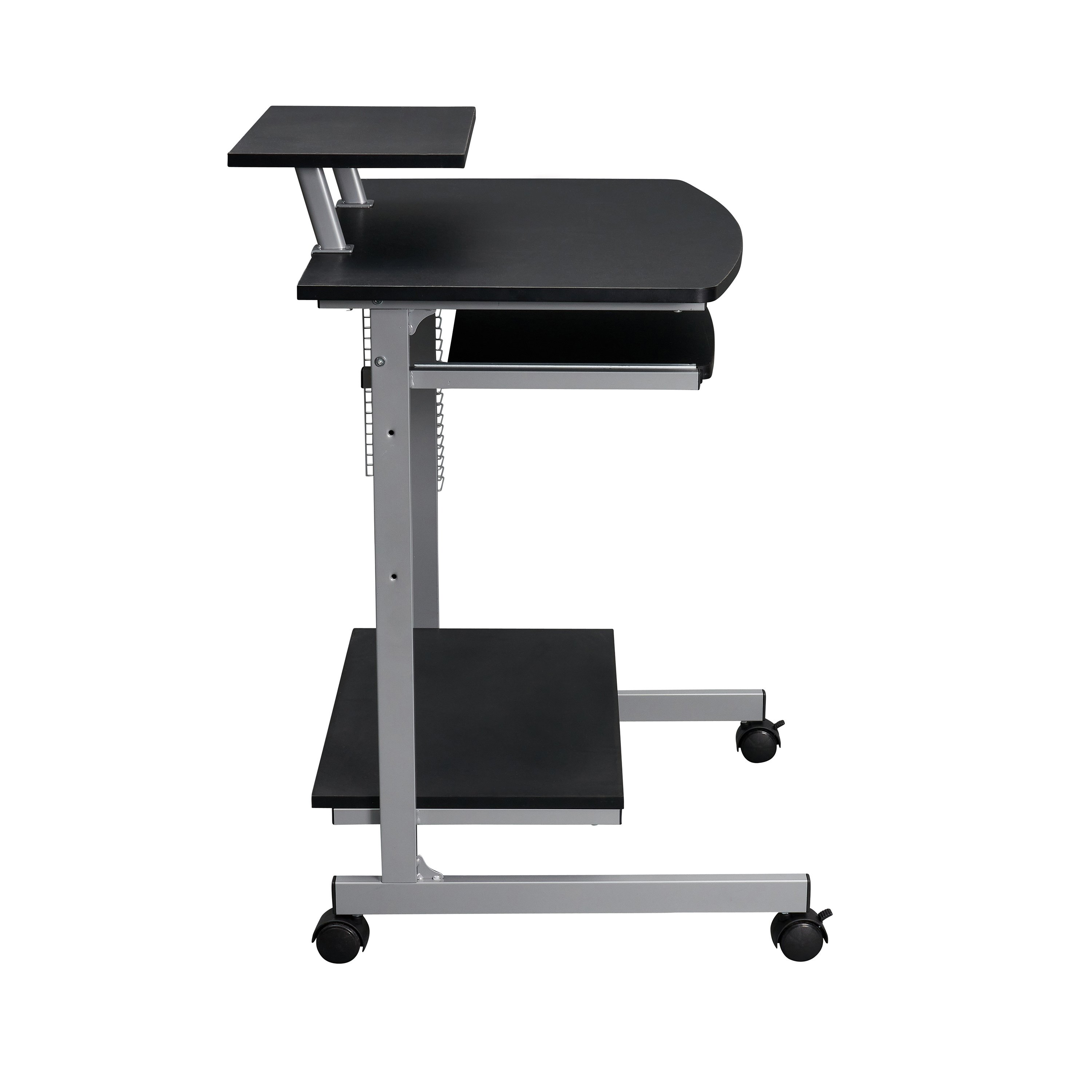 Techni Mobili Compact Computer Cart With Storage, GraphiteThis Techni Mobili Compact Computer Cart is made with heavy-duty engineered wood panels with a moisture resistant PVC laminate veneer and a scratch-resistant powder-coated steel frame. The adjustable shelf can be mounted center, right or left of desktop. It also features a slide-out keyboard shelf equipped with a safety stop, side media rack for CDs or DVDs, bottom accessory shelf, large bottom shelf to accommodate a CPU and accessories, and large double-wheel non-marking locking casters. The desktop has a 100lb weight capacity, the shelves each have a 30lb weight capacity, and the keyboard shelf can hold up to 20lbs. Color: Graphite