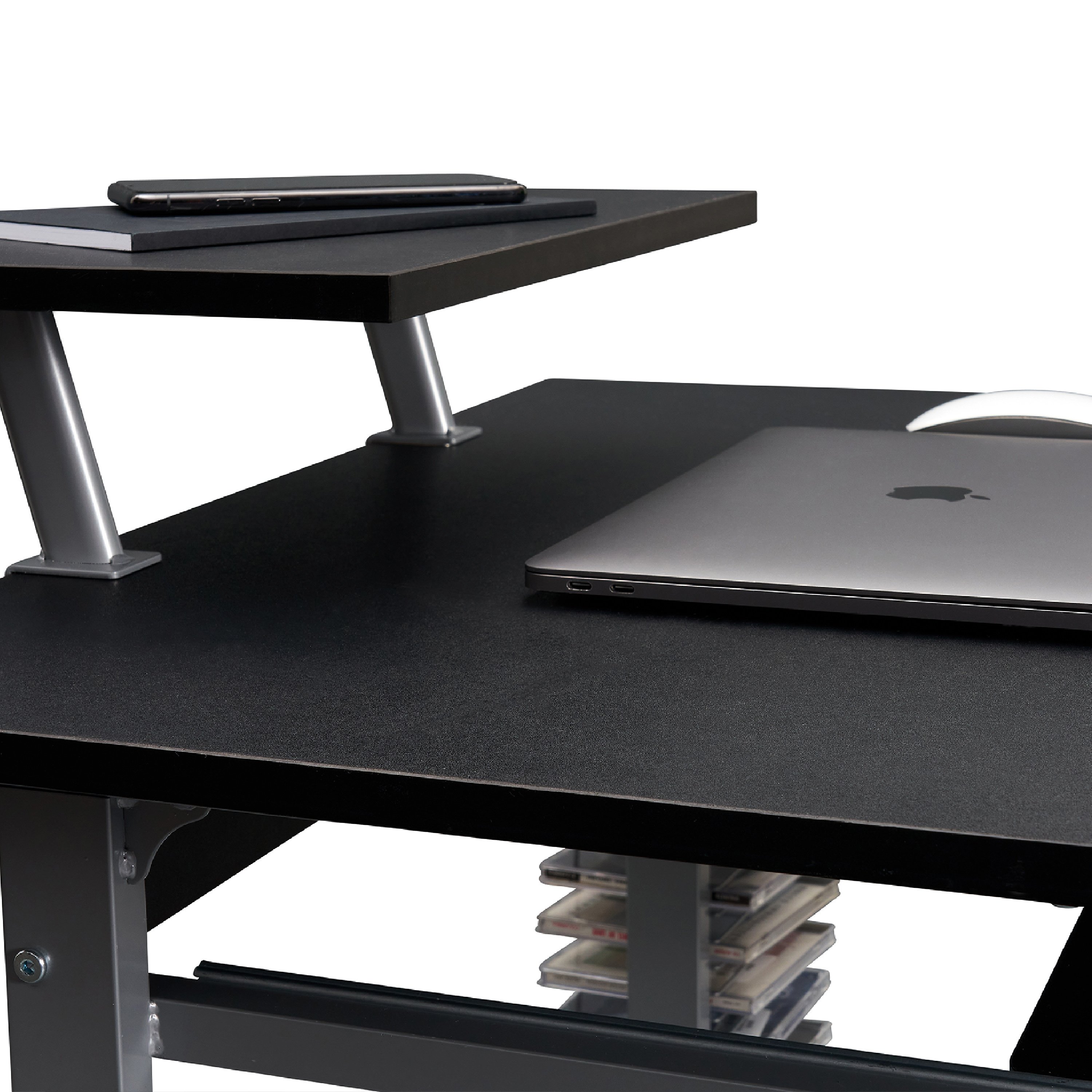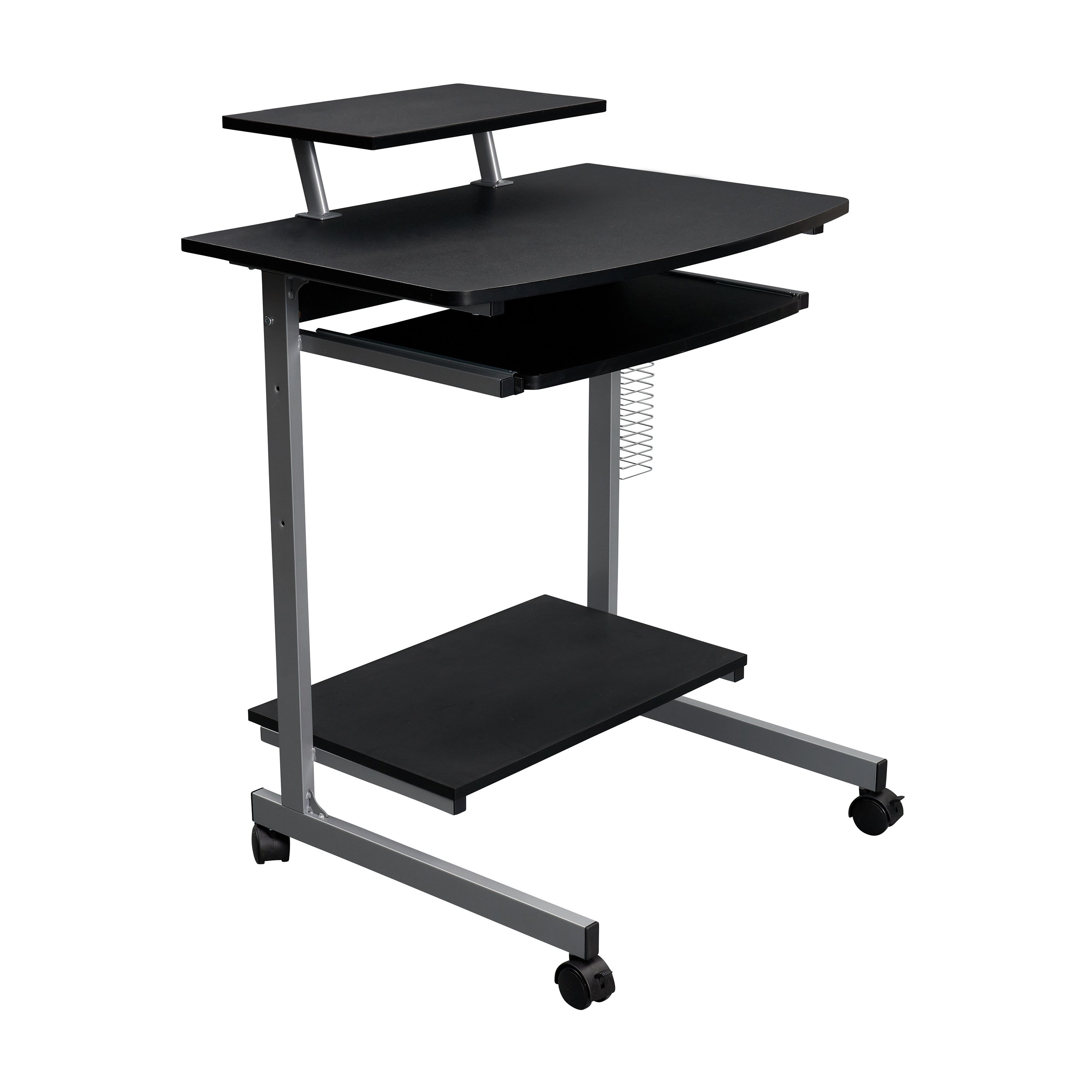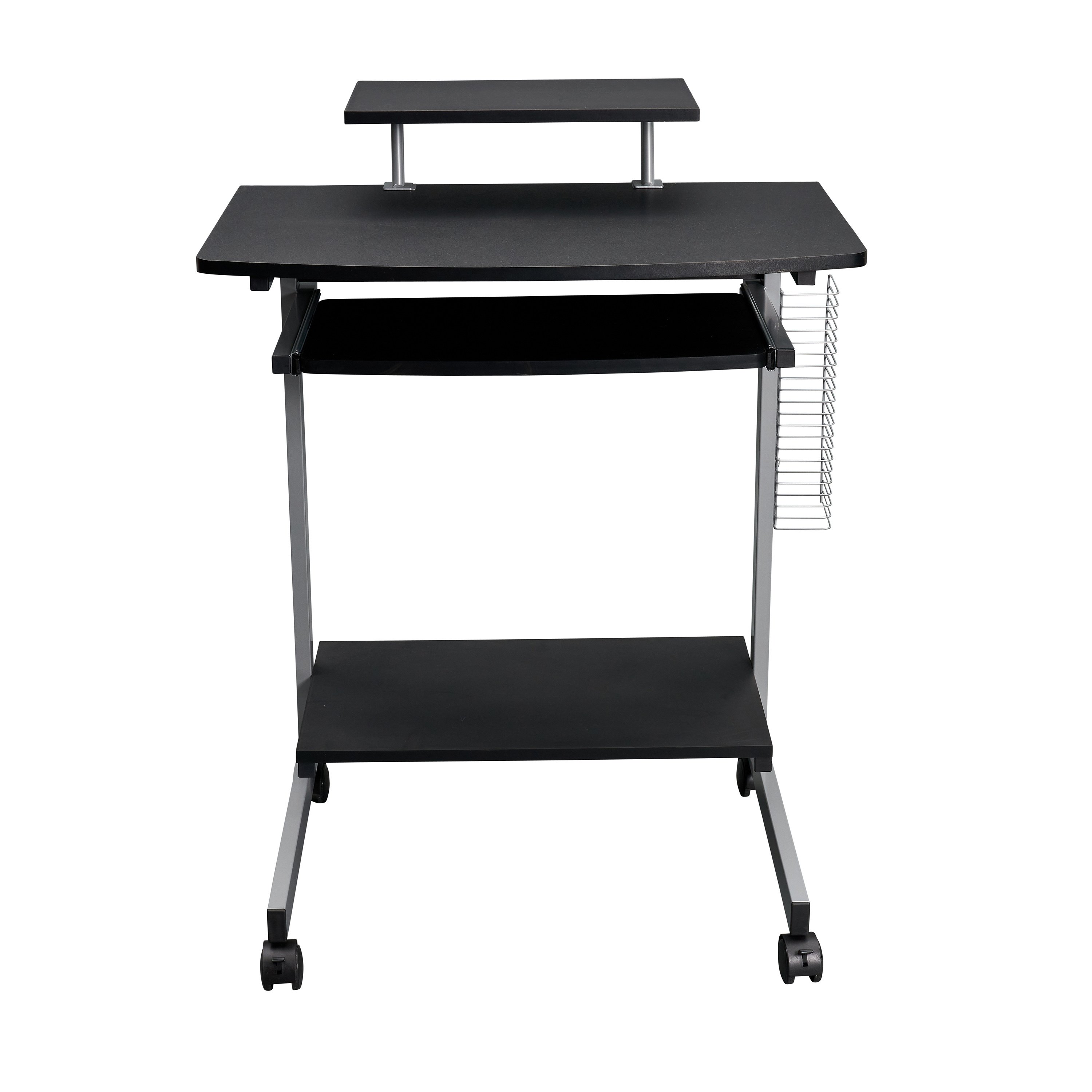 Techni Mobili Compact Computer Cart With Storage, GraphiteThis Techni Mobili Compact Computer Cart is made with heavy-duty engineered wood panels with a moisture resistant PVC laminate veneer and a scratch-resistant powder-coated steel frame. The adjustable shelf can be mounted center, right or left of desktop. It also features a slide-out keyboard shelf equipped with a safety stop, side media rack for CDs or DVDs, bottom accessory shelf, large bottom shelf to accommodate a CPU and accessories, and large double-wheel non-marking locking casters. The desktop has a 100lb weight capacity, the shelves each have a 30lb weight capacity, and the keyboard shelf can hold up to 20lbs. Color: Graphite
