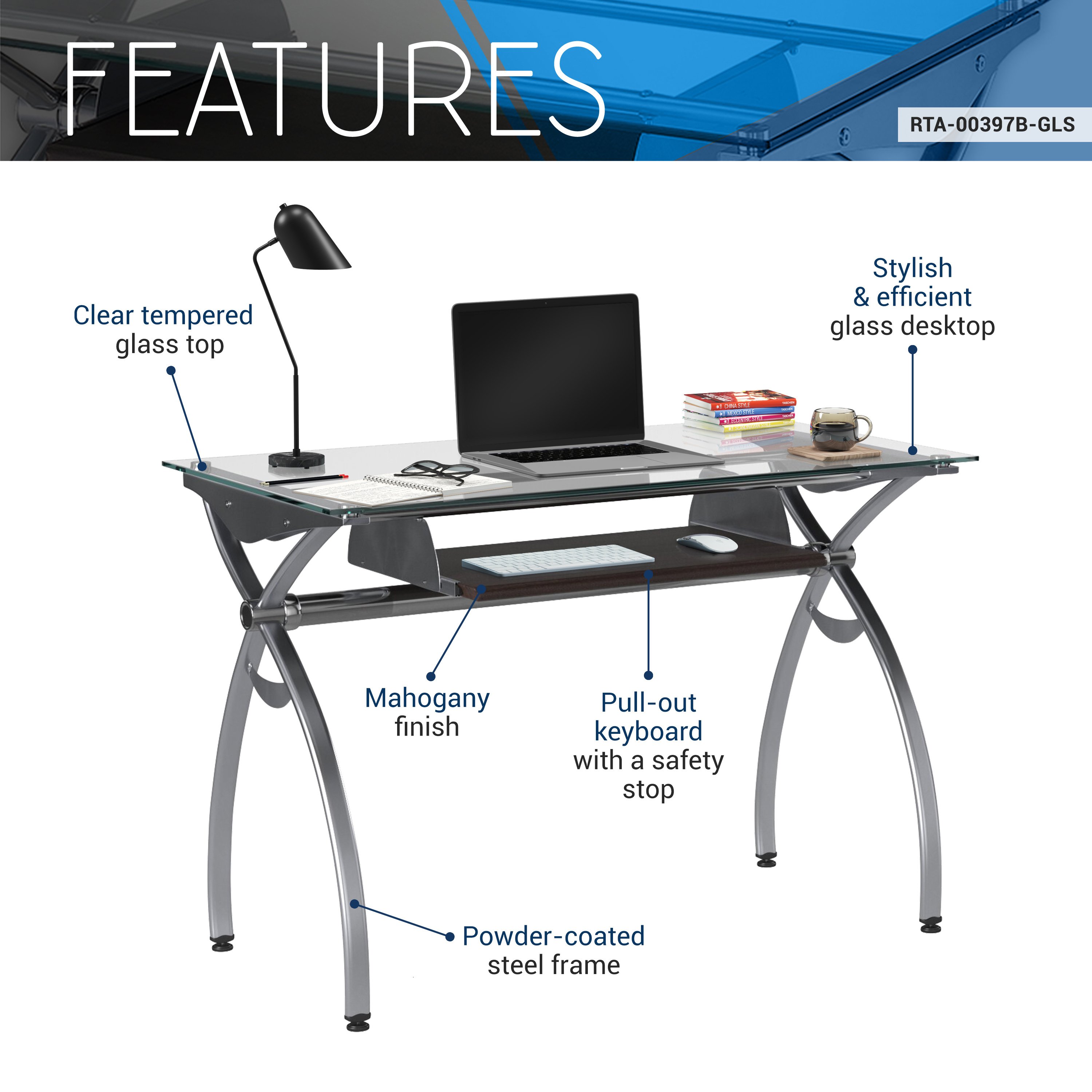 Techni Mobili Contempo Clear Glass Top Computer Desk with Pull Out Keyboard Panel, ClearThe contempo style of this Techni Mobili Glass-Top Computer Desk brings a crisp and smart ambiance to any office. It features a heavy-duty 8 mm tempered safety glass desktop, the stylish lines of a curved scratch-resistant powder-coated steel frame, and a pull-out keyboard panel with moisture resistant PVC laminate veneer in a Mahogany finish. With its compact footprint you can furnish your workspace with style and efficiency. The desktop has a 110 lbs. weight capacity and the keyboard shelf has a 33 lbs. weight capacity. It is ready and easy to assemble. Color: Clear Glass & Mahogany Keyboard