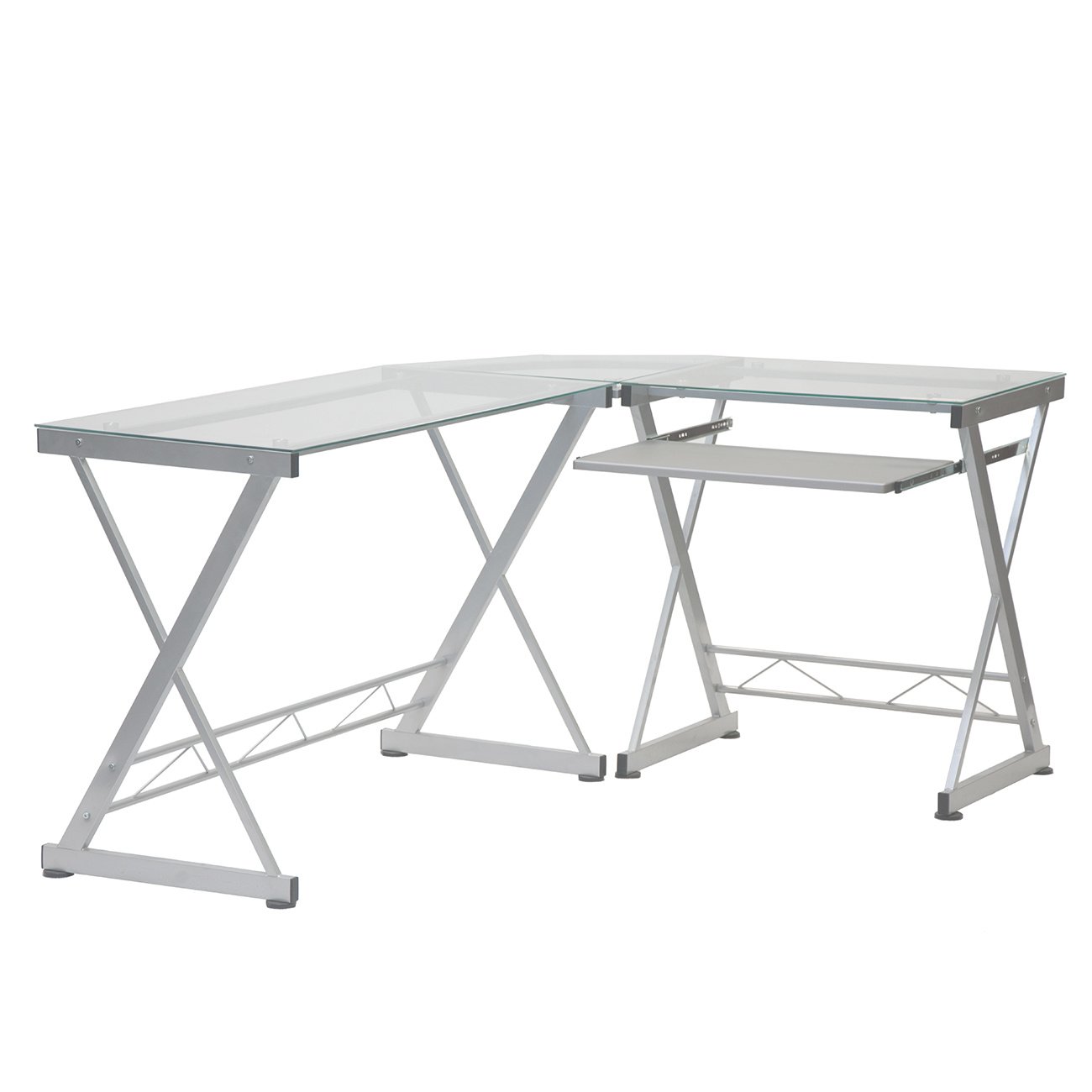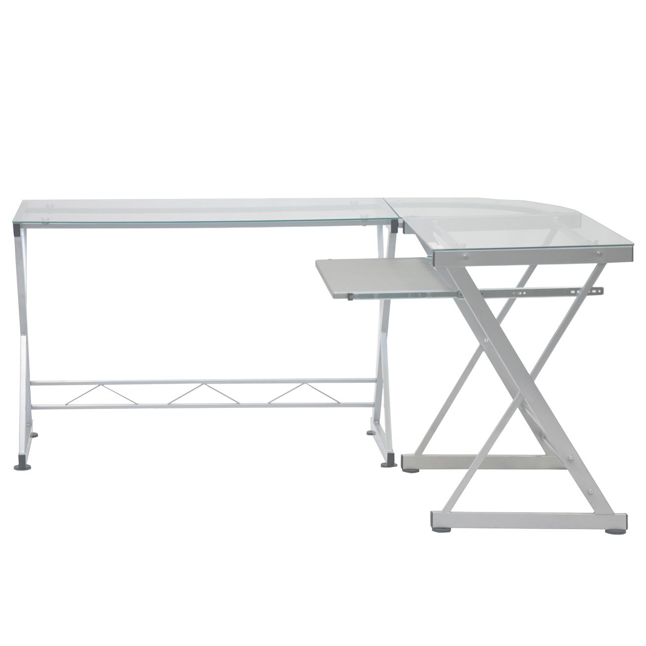 Techni Mobili L-Shaped Tempered Glass Top Computer Desk with Pull Out Keyboard Panel, Clear