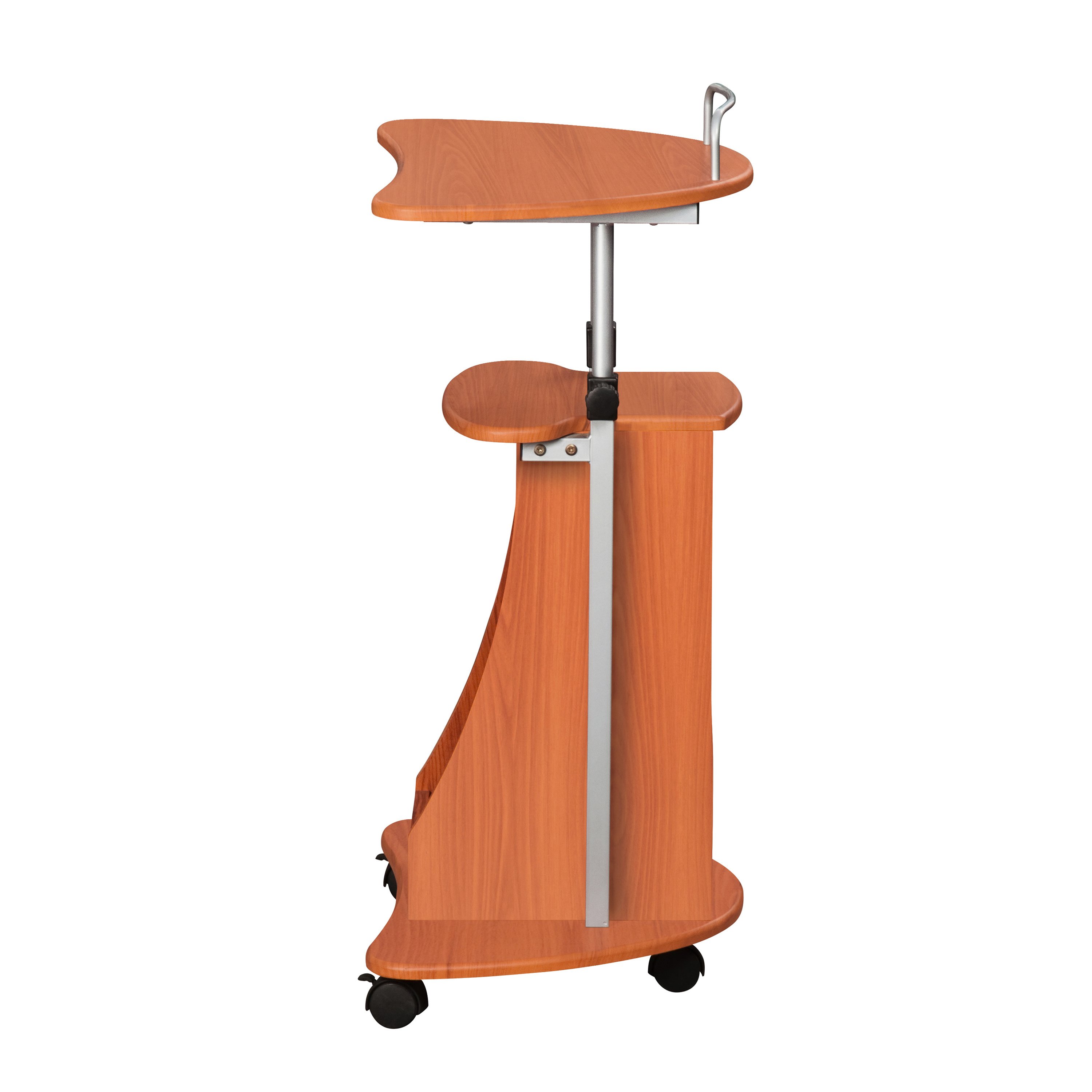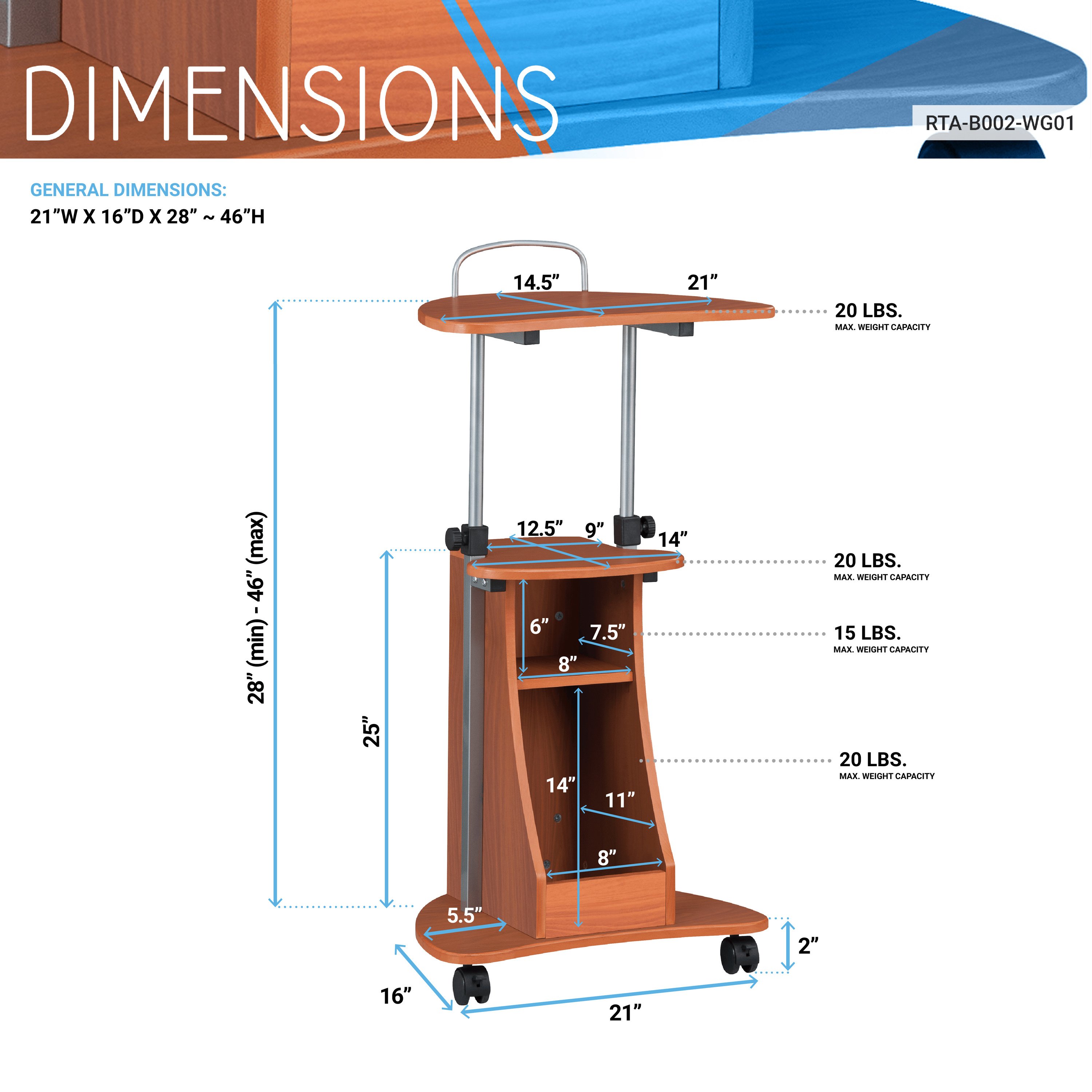 Techni Mobili Sit-to-Stand Rolling Adjustable Height Laptop Cart With Storage, WoodgrainThe Techni Mobili Sit-to-Stand Rolling Laptop Cart with Storage saves space while providing the laptop or writing setup you need. You can easily adjust the table height from 28" to 43" with dual adjustment knobs. The open storage compartment features an accessory shelf. Two of the fours non-marking nylon casters include a locking mechanism. The table top, accessory, and bottom shelves each have a 20lbs weight capacity and made of MDF panels with a moisture laminate veneer and a scratch-resistant powder-coated steel frame. Color: Woodgrain.